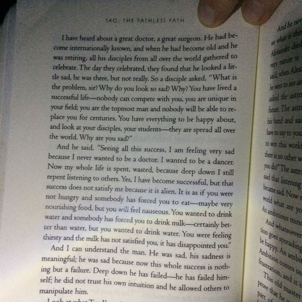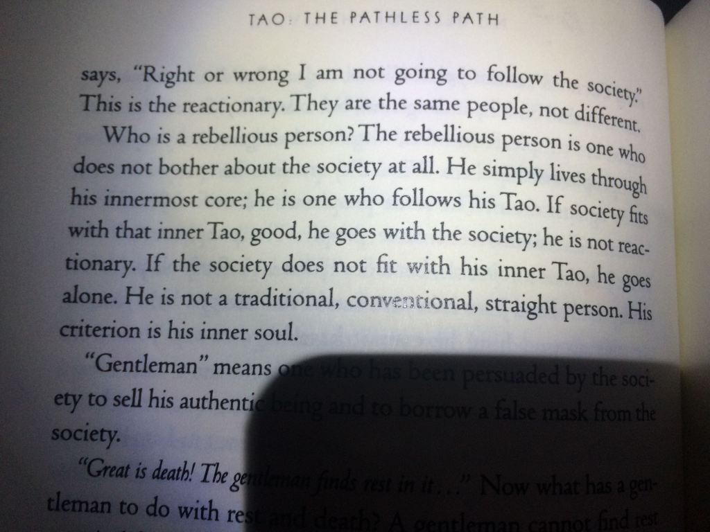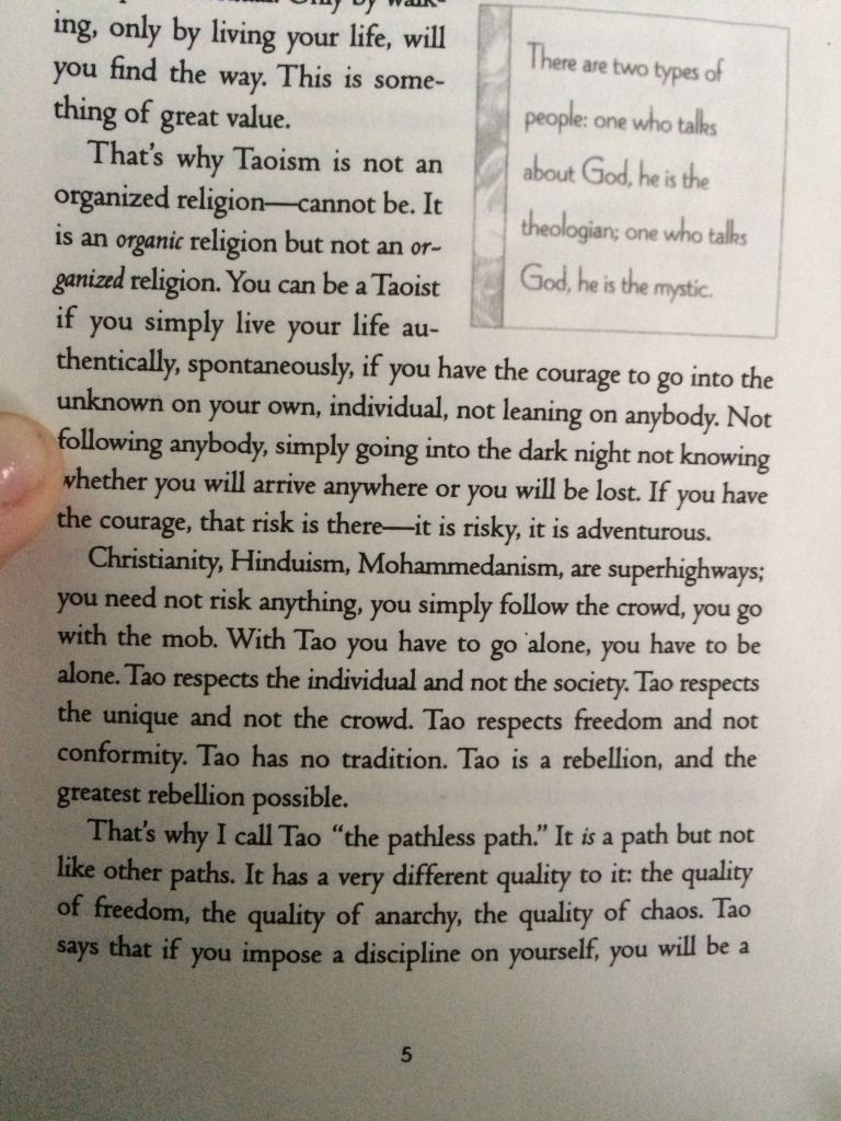 “That’s why Taoism is not organized religion – cannot be. It is an organic religion. You can be a Taoist if you simply live your life authentically, spontaneously, if you have the courage to go into the unknown on your own, individual, not leaning on anybody. Not following anybody, simply going into the dark night not knowing whether you will arrive anywhere or you will be lost. If you have the courage, that risk is there – it is risky, it is adventurous.