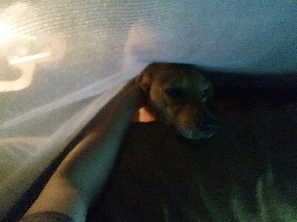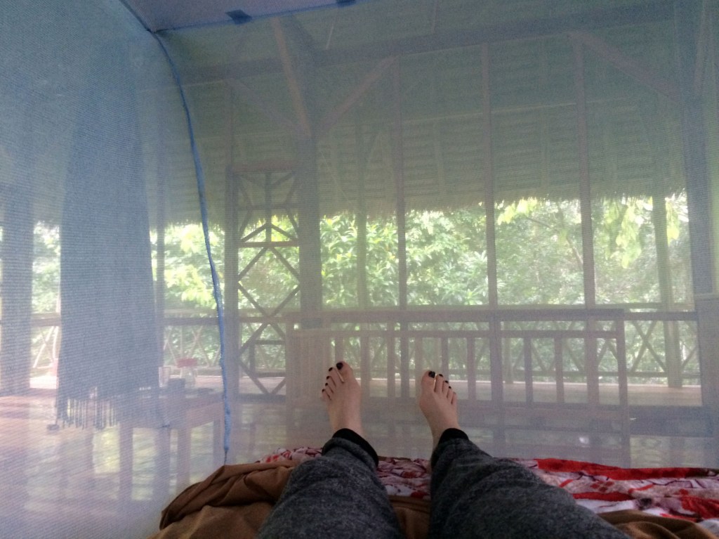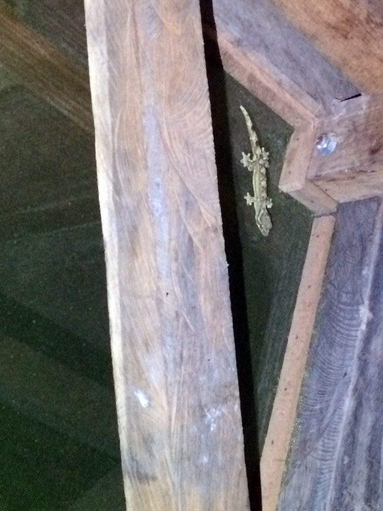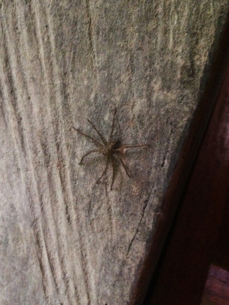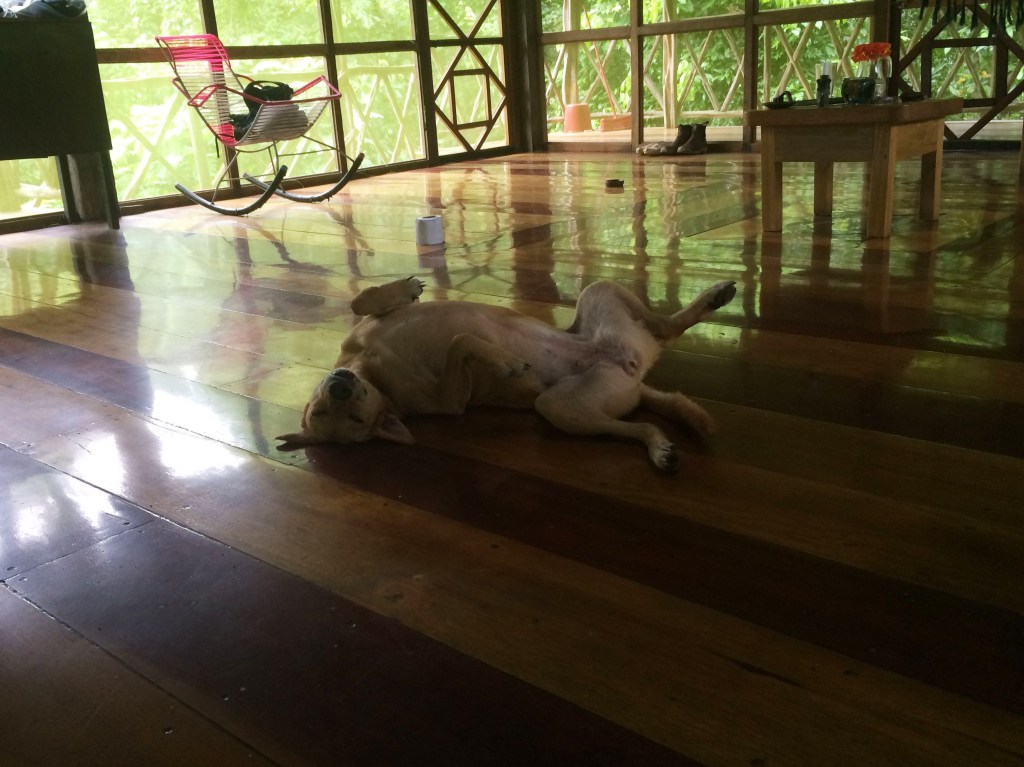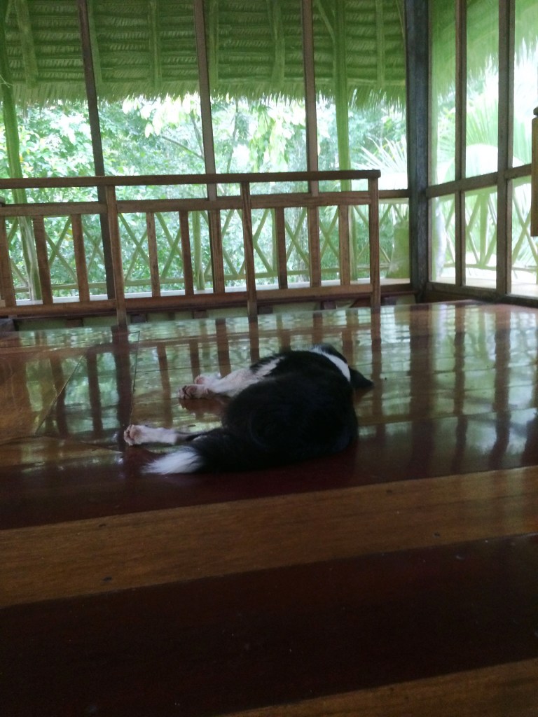 That evening, Delara and I broke our dieta rules and decided to hang out for a bit in my room. Our dinners were brought to us that evening, and since we had finished all three of our drinks, we were able to eat a bit more substantially. We sat around the small square table in the center of my room and we ate in the darkness, our plates lit up only by the light of two candles. Our dinner, our ‘salad’, consisted of a few boiled potatoes, many slices of cucumber and a giant mound of shredded carrot. It was strange to eat so much shredded carrot, but at that moment it was all so welcome in my mouth and in my belly. As we sat there in the darkness talking about life and sharing insights from the books Slocum had chosen for us, I felt something hit the left side of my chest. I looked down and there on my chest I saw a huge 2-inch long cockroach. I screamed and I flailed and I ripped my shirt off and threw it on the floor. Omg omg omg! My shirt! IT’S MOVING!! AAH! As I stood there freaking out, another one flew at me! We’re under attack! I managed to get the cockroach out of my shirt by dragging it to the door and tossing it onto the step outside. But then when I attempted to catch the next cockroach with a glass, a third cockroach came flying at us, and I screamed and dropped the glass, smashing it into pieces. The broken glass might have you think otherwise, but I’ve become a pro at catching and releasing spiders back home, so amidst the freakout, I managed to get rid of the cockroaches with Delara’s unbroken glass and a book. Now we were both feeling mighty uncomfortable in the darkness, unsure of what creepy crawlies might be hiding, so we decided to explore the tambo up and down with our flashlights. That night, including the ones that attacked us, we found 4 cockroaches, 4 large spiders, 1 gecko, and one 3 inch long millipede. We screamed so many times, Sto came to the room asking What’s with all the screaming ladies? He laughed at us when we told him about the attack and all of the creepy visitors we’d found. He reminded us that we’re in a jungle and it kind of comes with the territory, and he told us that maybe it’s best if we didn’t go searching for them because that’s the best way to ensure finding them. He was absolutely right, but after that night, it became a tradition for the two of us to search each other’s rooms when we made it back each evening. At least then we knew what to be wary of. That night, I had two more visitors to my room and they stayed all evening until I left the next morning; Gaia and because I don’t know the other’s name, I’ll make it up and call her Goldie, two of the dogs that live at Amaru. They came right to my door wanting in so I gave them head scratches and they slept on my floor until the morning.